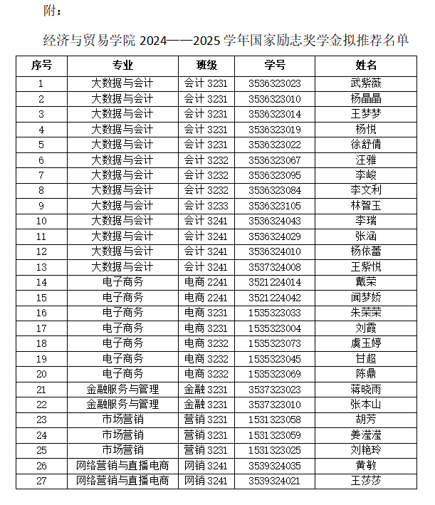 根据安徽机电职业技术学院国家励志奖学金管理实施办法(修订)》(校字〔2025〕130号)文件规定,经过个人申请、班级评议、辅导员审核、学院领导小组评审,现将2024-2025学年国家励志奖学金拟推荐名单予以公示,公示期为5个工作日(2025年10月10日——10月15日)。公示期内,如对以上结果有异议,请向学院反映。