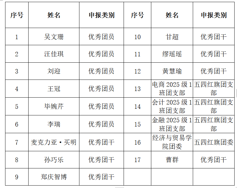 根据关于开展2026年团内评优评先工作的通知,经个人申请,学院评选,现在将拟推荐学校名单予以公示,公示期为三天(2026年4月8日-4月10日)。公示期内,如对以上结果有异议,请向学院反映。