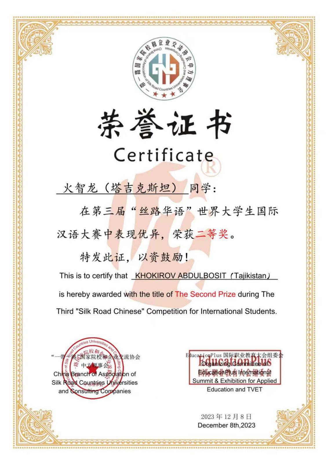 2023年12月8日,第三届“丝路华语”世界大学生国际汉语大赛现场总决赛在黄河水利职业技术学院圆满落幕,经过前期网络投票、现场决赛和专家评审等环节激烈角逐,我校2022级塔吉克斯坦籍国际学生火智龙(KHOKIROV ABDULBOSIT)脱颖而出,并荣获决赛二等奖,陶云等获得“优秀指导教师”称号。