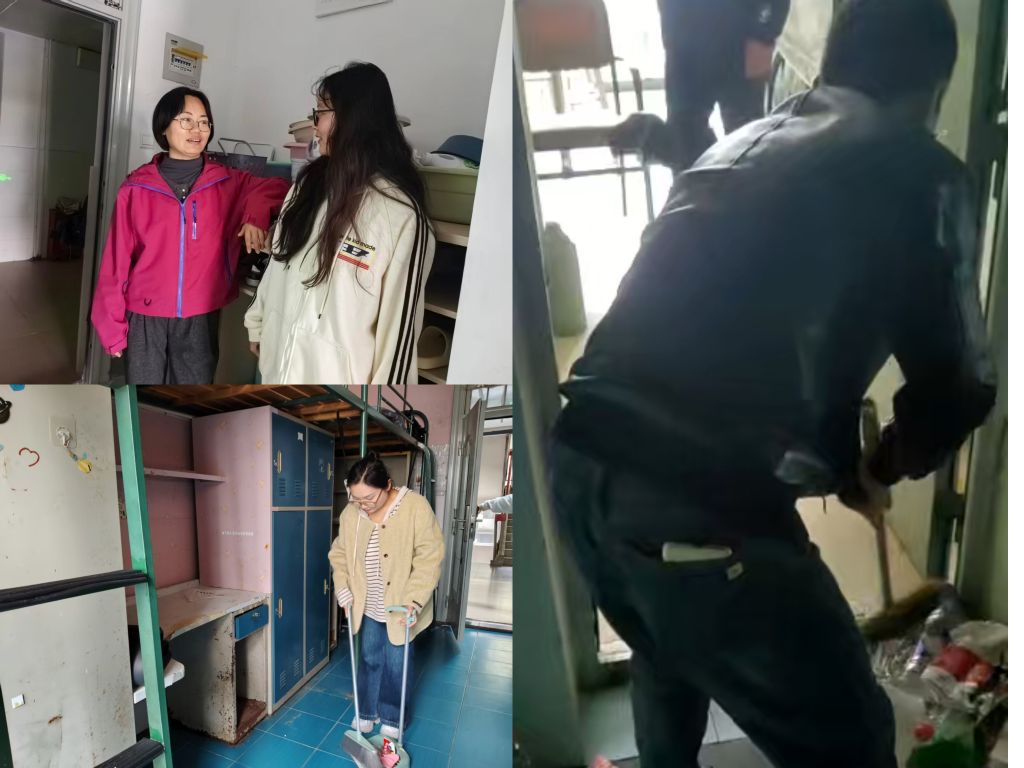 各位辅导员带领学生志愿者分组行动,手持扫帚、拖把、抹布等工具,对实习学生所在楼层的宿舍楼道、走廊、公共阳台等区域进行了细致清扫。大家分工协作,清理卫生死角、整理公共物品,确保公共区域干净整洁。